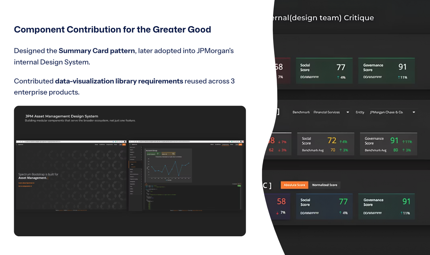 The summary card component was integrated into JPMorgan's internal Design System, with its data-visualization library reused across three enterprise products, extending the design impact beyond the original ESG Dashboard.Key Takeaway: Good enterprise UX isn't just about clarity; it's about empowering people to act responsibly with confidence and speed.